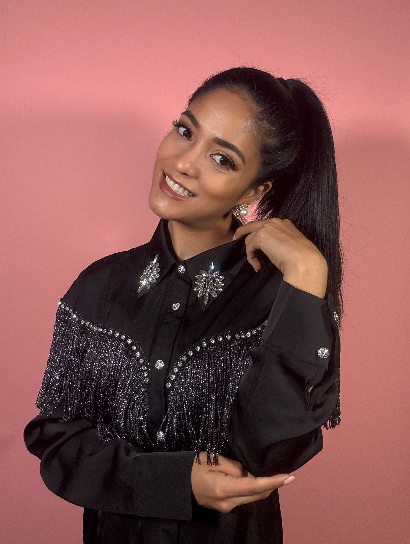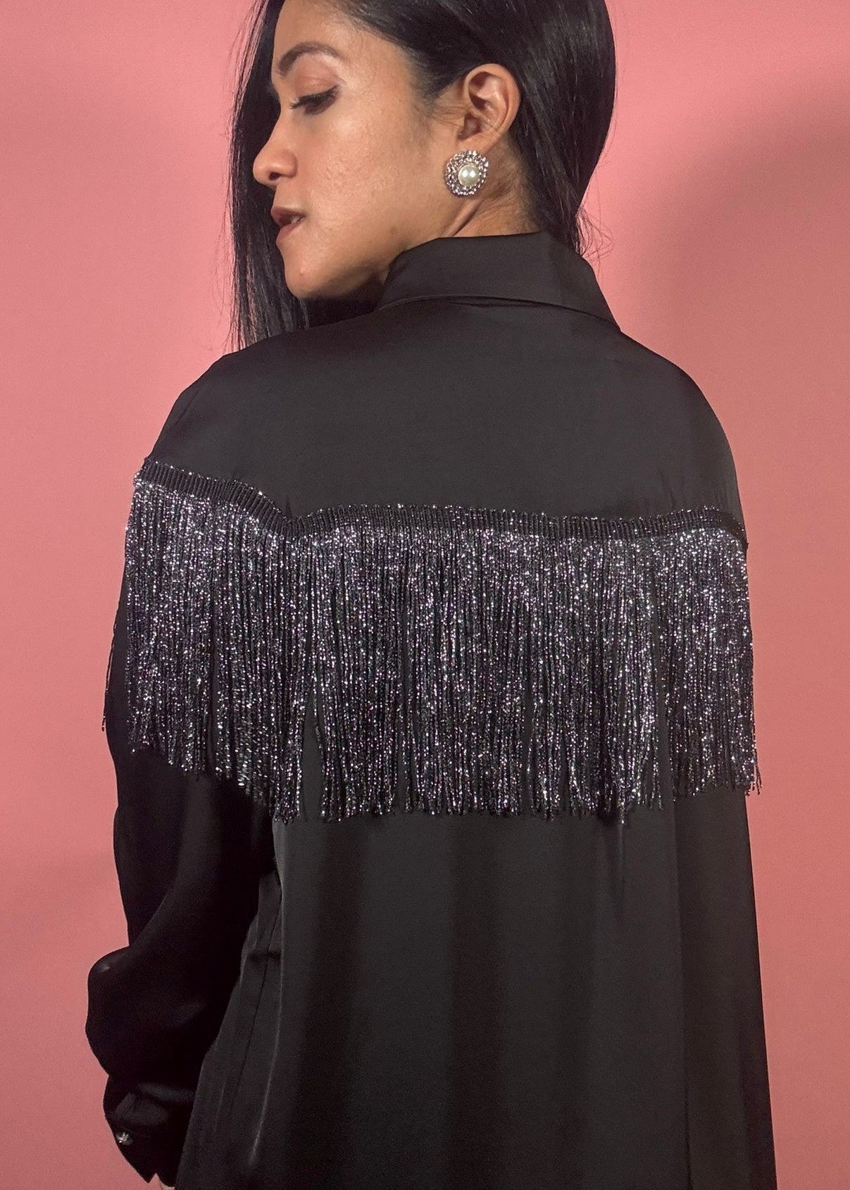 Make a dazzling entrance in the Rhinestone Sequined Tassel Satin Blouse — a bold blend of luxury and sparkle. Crafted from smooth, glossy satin, this blouse catches the light from every angle. It features dramatic rhinestone fringe detailing and sequined accents, creating movement and shimmer with every step.
