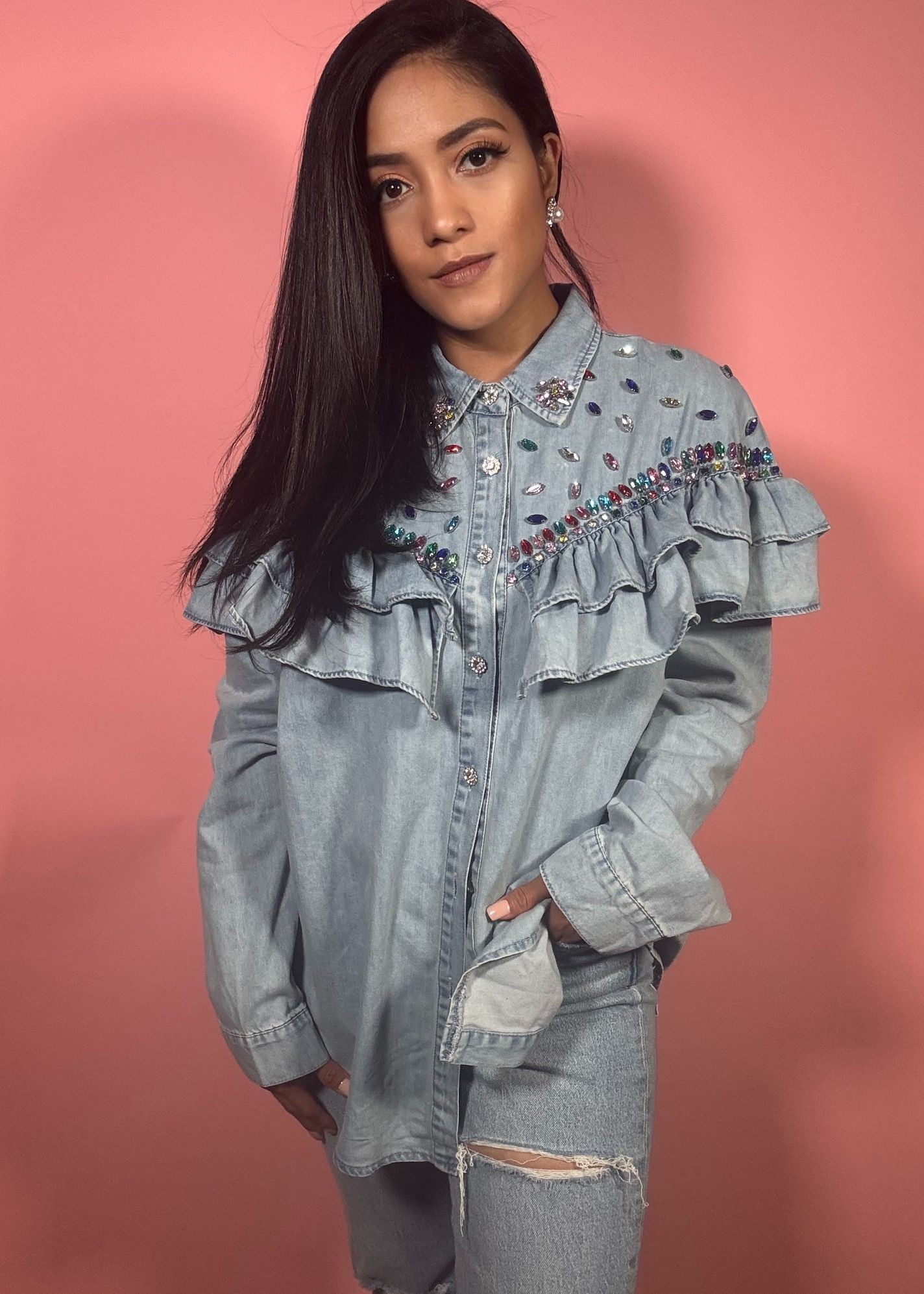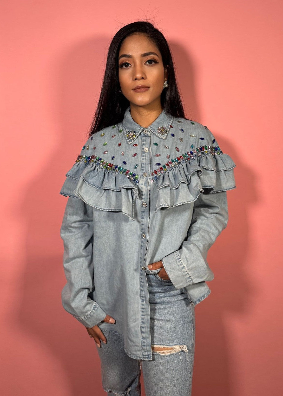 Turn everyday denim into a statement with the Crystal Ruffle Denim Long Sleeve Shirt — where classic meets sparkle. Crafted from soft yet structured denim, this shirt features elegant ruffle detailing along the front placket and cuffs, adding a touch of feminine flair.