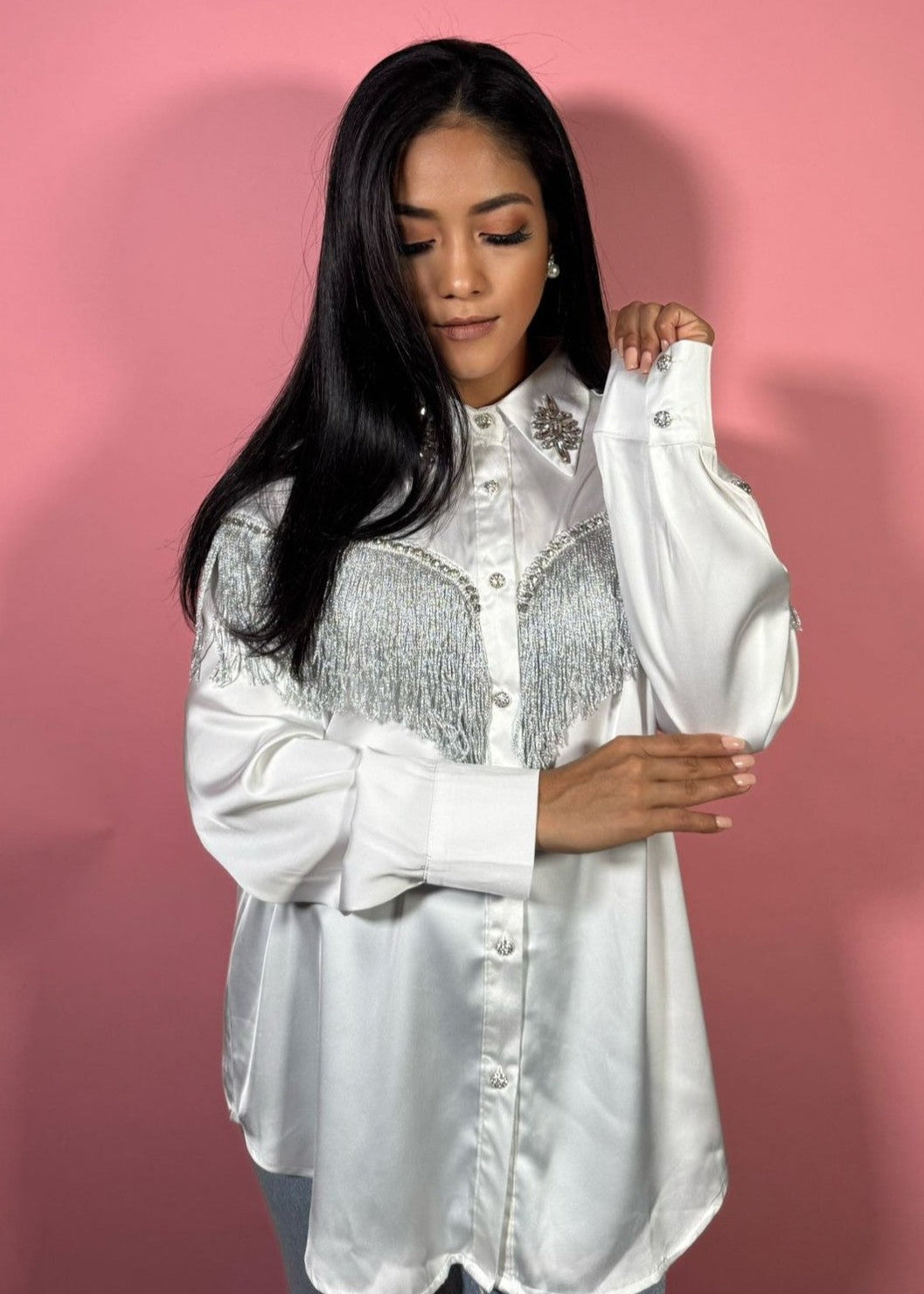 White Rhinestone Sequined Tassel Satin Blouse
